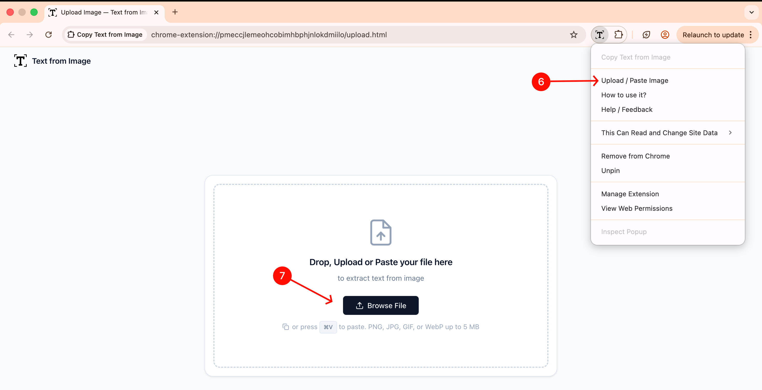 4. Alternatively, right click the extension icon and choose "Upload / Paste Image" to extract text from an uploaded or pasted image instead.